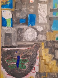 In questa serie di dipinti si nota un’altra tecnica cara a Pedrinolla, ossia l’inserzione frammentaria di disegni che si rifanno all’arte infantile; i modelli sono quelli della figlia, ma la chiave di lettura è dell’adulta, dell’artista consapevole. Tradurre è tradire, o comunque è sempre reinterpretare. È qui la natura duplice di queste opere e in particolare di questi disegni, o parti di essi è inequivocabile: questi hanno perso l’anima, per così dire, innocente tipica della fanciullezza, immagazzinando in se stessi il vissuto dell’artista. Sono questi disegni carichi di molto altro, e molto più pesante di quanto un bambino potrebbe fare.