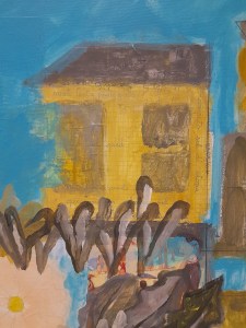 Formalmente quella di Pedrinolla, in queste serie di opere, è una pittura sintetica, ossia dotata di campiture piene, gli sfumati sono assenti, le figure sono sagome accennate, i fondi compatti; i luoghi rappresentati, poco caratterizzati, ammesso abbiano un’origine – come dire? – retinica, sono luoghi interiori. E come ho detto in ogni tela sono presenti parziali stratificazioni di ritagli di carta e frammenti vari; è come se le opere fossero rattoppate con strati di memoria, di ricordi: e questi sono dettagli che rimandano a mondi altri, certo, ma allo stesso tempo hanno una valenza fortemente decorativa. E ancora: la prospettiva è inesistente, il mondo è piatto, a due dimensioni (come fanno i bimbi, gli alberi sono uno sopra l’altro, a cascata), le scale sono accennate. Mondi colorati, eppure oscuri.